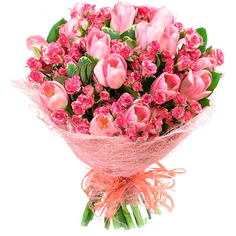 Букет состоит из 15 розовых тюльпанов, 8 розовых кустовых роз, зелень, красивая упаковка, атласная лента.